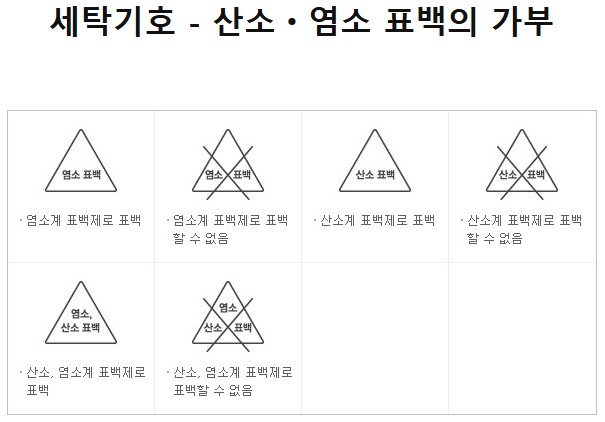 **빈 삼각형(△)**은 산소계 표백 허용, △에 가로줄은 염소 금지, **×**는 표백 전면 금지입니다.