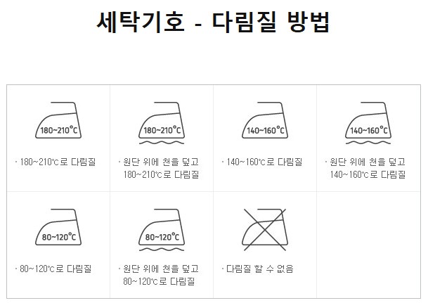 - 다림질은 라벨 온도 이하+천 덮기가 기본